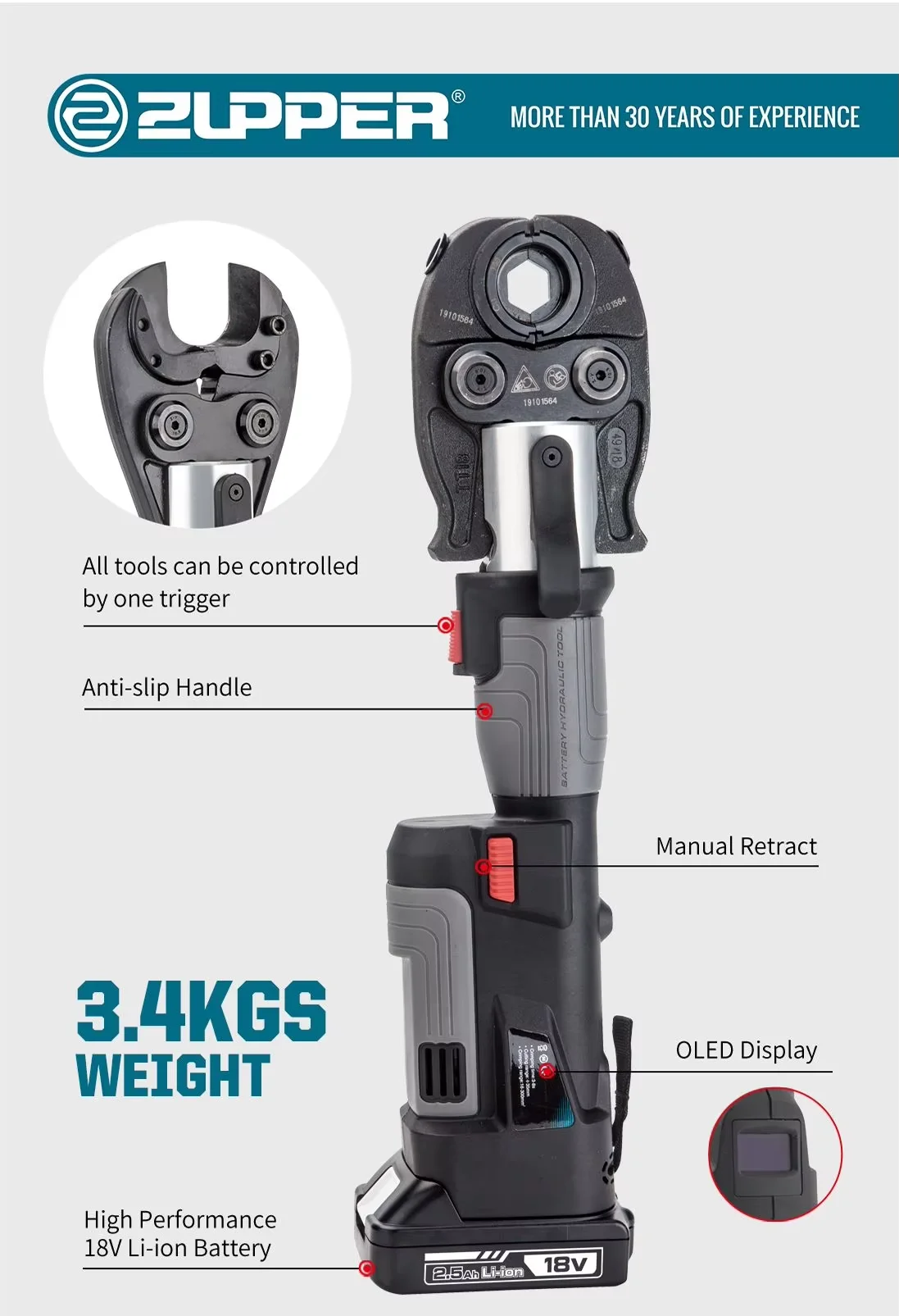 ZUPPER PZ-2430 Battery Powered Hydraulic Pipe Pro Press Tool for Pex Steel Copper Pipe Without Jaws