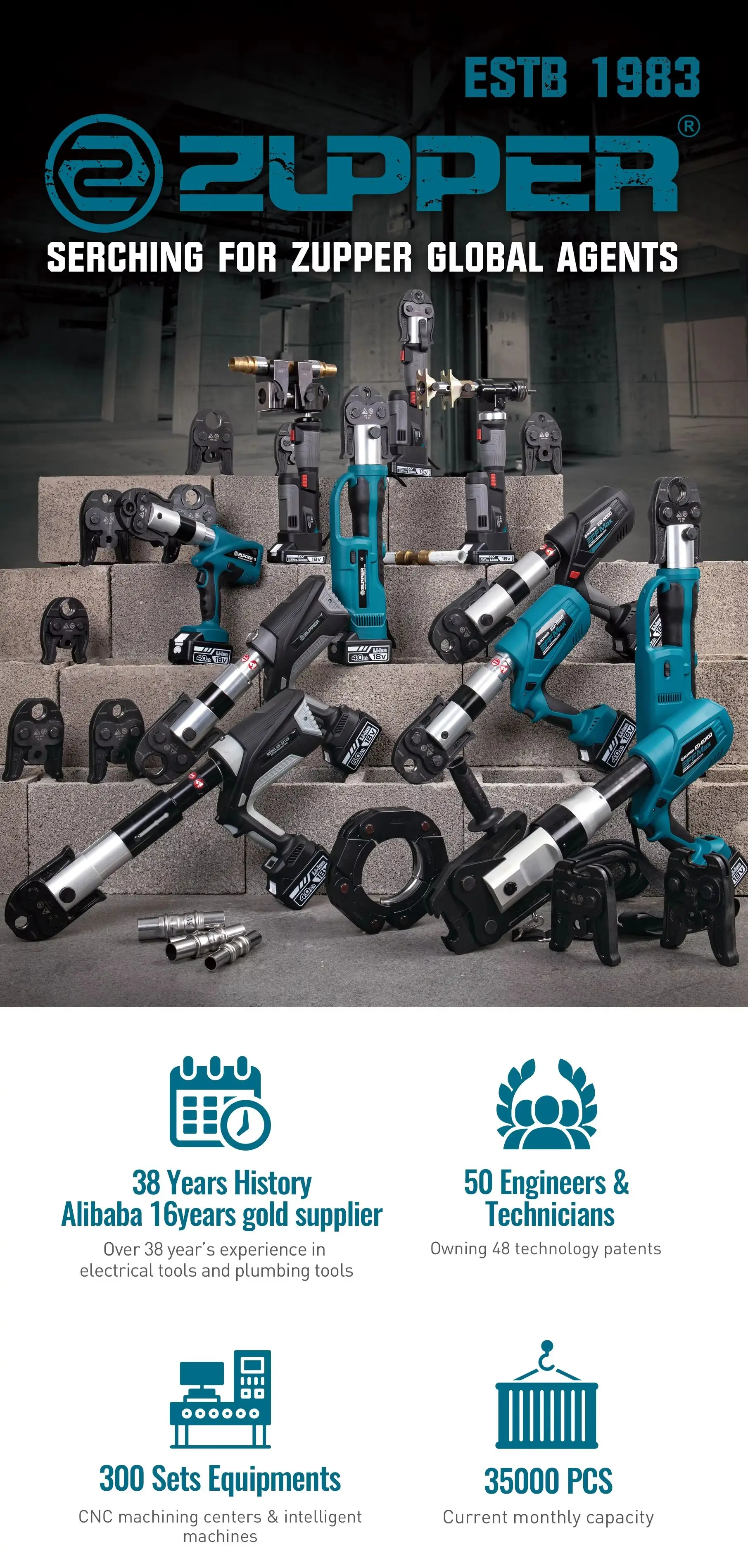 Since the company began from 1983, ZUPPER TOOL has experienced from made in China"to "Created in China", We has become the leader of battery hydraulic tools in China more than 30 years. We build the electrical tools and tools for plumbing and heating installation last for years, but what we do can last forever. We manufacture best-in-class products by 300 strong highly trained team and sold over 100 countries.We work continuously to improve the quality, efficiency and safety of our oroducts to meet global market expectations and requirements. Accordingly many of our products are patented and comply with various international standards ZUPPER products and you, together, WE BUILD